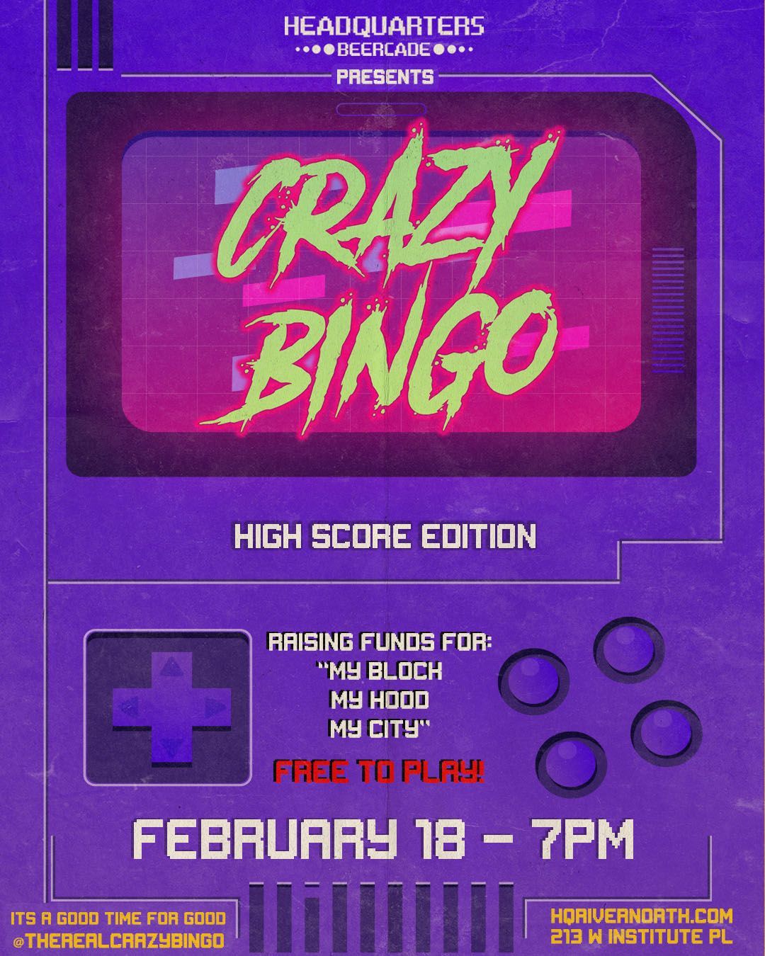 LOCATED IN RIVER NORTH, HEADQUARTERS BEERCADE IS TAKING THE TRADITIONAL BAR SETTING TO THE NEXT LEVEL. HQ OFFERS A LOW-MAINTENANCE NIGHT WITH HIGH-ENERGY ENTERTAINMENT THAT IS PERFECT FOR NIGHTLIFE, DATES, OR A CHILL NIGHT OUT. CHOOSE FROM A FULL MENU OF MODERN, FRESH AMERICAN FOOD, INNOVATIVE SIGNATURE COCKTAILS, AND DOZENS OF FREE VINTAGE ARCADE GAMES. JOIN US ANY DAY OF THE WEEK AS WE’RE OPEN 365 DAYS A YEAR!